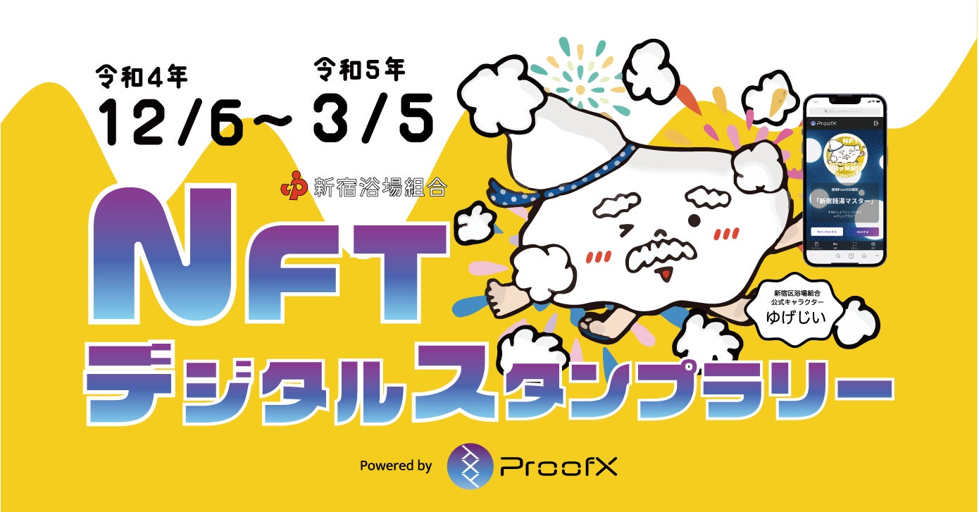 令和4年12月6日(火)〜令和5年3月5日(日)に、新宿浴場組合様が開催する、新宿区内18箇所を対象としたNFTデジタルスタンプラリー企画において、株式会社ProofX(プルーフエックス)のNFT発行サービス「ProofX」が活用される。各店舗に設置されたQRコードを読み取ることで、各店舗オリジナルデザインの来店記念NFTを獲得するイベント。ラリー形式のイベントで、条件をクリアすると様々な「称号NFT」やそれに応じた景品を獲得できる。