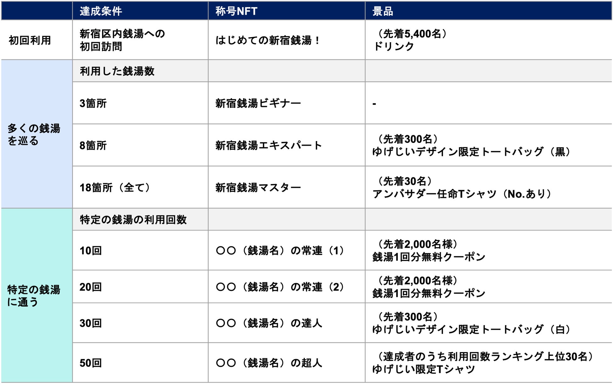 そして、今回のイベントでは、銭湯を訪れて「NFTスタンプ」をもらえるだけでなく、所定の条件をクリアすると「称号NFT」を獲得できます。